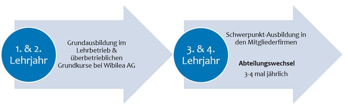 Jede Verbundsfirma bietet spezifische Ausbildungsmodule an, so dass über die Lehrzeit alle gemäss Ausbildungsreglement erforderlichen Fähigkeiten erlernt werden. Die Versetzungspläne erstellt eine Fachkommission nach Rücksprache mit den einzelnen Verbundsfirmen.